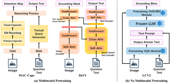 | MAC-Caps [7] | Integrating a capsule network module with a query selection mechanism into the MAC VQA systems improved the model’s answer grounding capabilities. | Pros: The introduced capsule network module enhances the attention and comprehension of the visual information mentioned in the question. Cons: The grounding of visual cues is provided by attention maps, which are subject to attentional interference and lack of fine granularity, affecting the accuracy of visual cue grounding. |