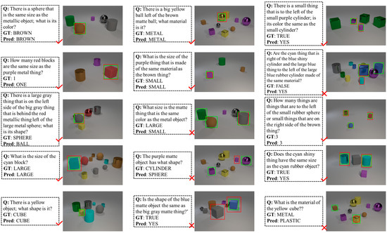 - Johnson, J.; Hariharan, B.; Van Der Maaten, L.; Fei-Fei, L.; Lawrence Zitnick, C.; Girshick, R. Clevr: A diagnostic dataset for compositional language and elementary visual reasoning. In Proceedings of the IEEE Conference on Computer Vision and Pattern Recognition, Honolulu, HI, USA, 21–26 July 2017; pp. 2901–2910. [Google Scholar]