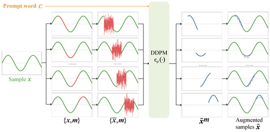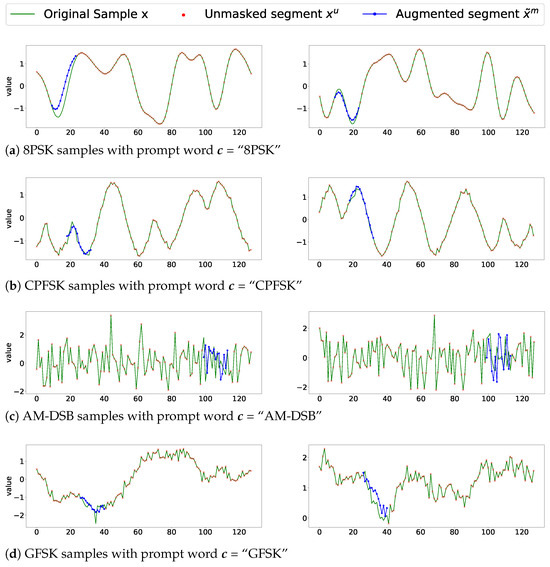 - Signal embedding. The reconstructed segment is then embedded back into the original signal sample by replacing the original masked segment. This produces a new augmented signal sample , shown as blue solid lines in Figure 1, with the original depicted as gray dotted lines.