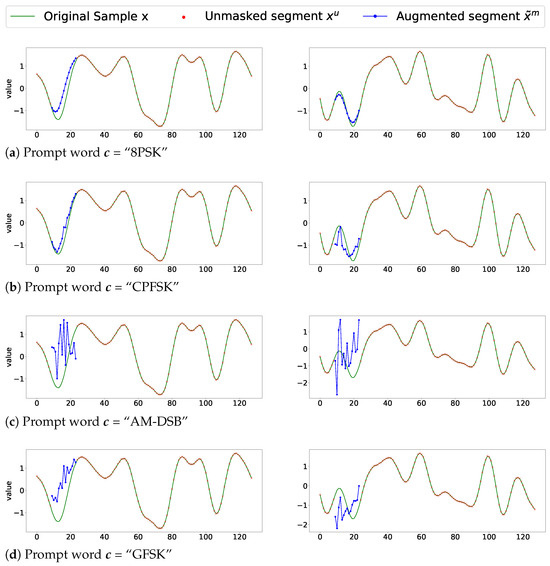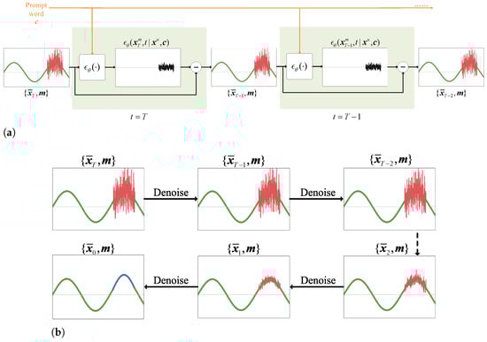 - Signal denoising. An adapted DDPM is employed to reconstruct the signal from the noise. This process is influenced by a prompt word vector , representing the modulation category’s one-hot encoding. The pair and the prompt word are input into the DDPM, which outputs , approximating based on the unmasked segments .