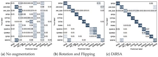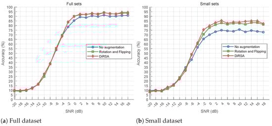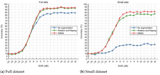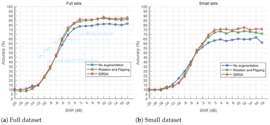 - Compared to traditional signal augmentation methods, such as rotation and flipping, DiRSA-augmented datasets can achieve more effective modulation classification performance. When using long short-term memory (LSTM) [21], CNNs, and convolutional long short-term memory fully connected deep neural networks (CLDNNs) [22], DiRSA performs 2.75–5.92% better than rotation and flipping in small dataset scenarios at an SNR higher than 0 dB.