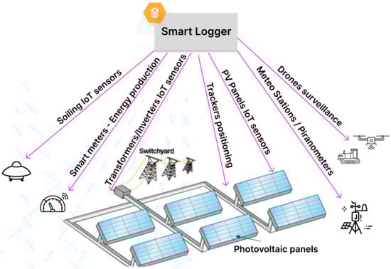 More in detail, the data module (DM) is devoted to the seamless integration of any IoT device and of any type of sensor deployed across the photovoltaic plant. The module acts as a central hub for collecting and processing data from these devices, easing the remote monitoring [26] and management of the plant in order to enhance its operational efficiency and reliability. It has to be designed and realized to support a wide range of IoT devices and transmission protocols, to perform real-time data collection and processing for immediate insights, and finally, to assure the most reliable and safe data transmission and storage to protect sensitive information.