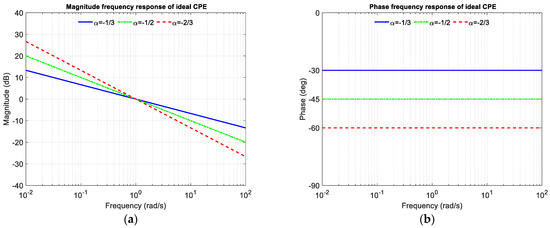 The magnitude and phase of normalised ideal CPE for α = −1/3 (−30°), −1/2 (−45°), and −2/3 (−60°) are shown in Figure 1.
