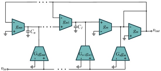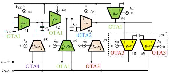 The inverse follow-the-leader (IFLF) multi-feedback topology as in [21,22], constructed using OTAs as active elements and grounded capacitors, is an excellent candidate for the physical realisation of H(s) in Equations (5) and (6) and is shown in Figure 2. It realises the voltage transfer function with asymmetrical input and asymmetrical output.