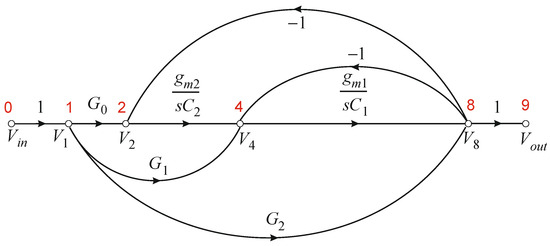 Using Mason’s (general) multi-path reduction rule for SFGs, we can calculate a transfer function T between any two nodes in the SFG [30,31]. Mason’s general rule is as follows:
