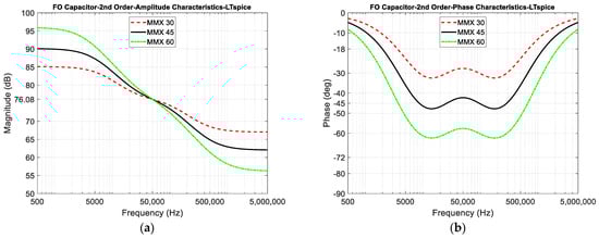 The post-layout (solid) and pre-layout (dashed) results of the AC analysis are demonstrated in Figure 18. Figure 18a shows the magnitude-frequency characteristics of the implemented CPE element for three characteristic angles (−30°, −45°, and −60°). It can be observed that the slope by which magnitude falls with frequency corresponds with the implemented angle. For the classical capacitor, the slope would always be −20 dB per decade. Since the fractional order capacitors are presented, slopes are −6.67 dB, −10 dB, and −13.33 dB per decade for 30°, 45°, and 60°, respectively. The phase-frequency characteristics for three implemented angles are shown in Figure 18b.