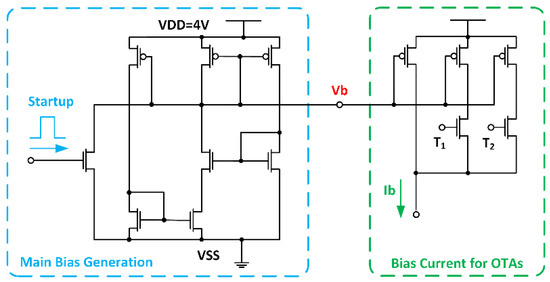 The circuit in Figure 15 is used to provide bias currents. The main bias generation circuit (blue block) is used to generate a stable bias current, which is later mirrored (green block) with a factor suitable for the individual OTAs. Since each OTA needs 3 different currents to implement different phases (30°, 45°, and 60°), the mirroring factor can be digitally controlled with 2 bits (T1 and T2). A manual startup was implemented as a failsafe mechanism to ensure the necessary initial conditions.