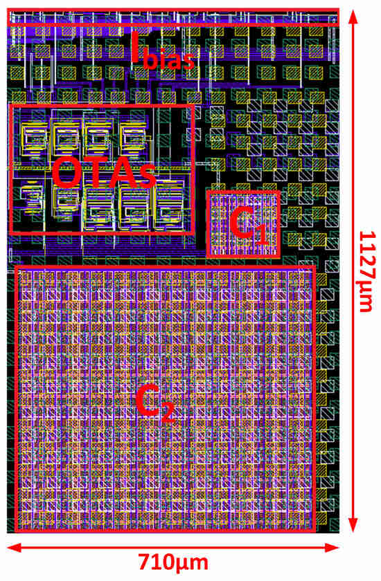 The whole system was implemented in the AMS 350 nm technology node using Cadence Virtuoso tools for the design process. The layout showing the size and location of the subcircuits is presented in Figure 16, indicating a total area of 710 × 1127 µm2. The post-layout study with corresponding simulated results was conducted as a proof of concept, and it is presented in the following Section 4.