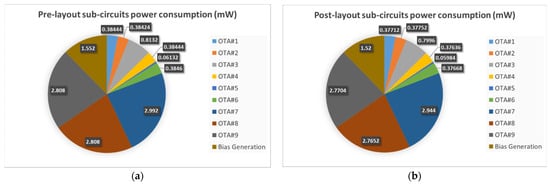 The power consumption of the entire system is 12.37 mW (12.57 mW pre-layout). Figure 17 shows the power consumption of the individual sub-circuits for pre-layout (Figure 17a) and post-layout (Figure 17b) analysis. For an explanation of the post-layout analysis, see Section 4.