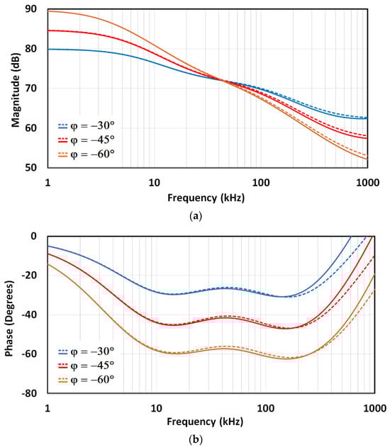 Figure 18. (a) Magnitude- and (b) phase-frequency characteristics (φ = −30°, −45°, −60°). The dashed lines represent the pre-layout analysis, while the solid lines represent the post-layout analysis.