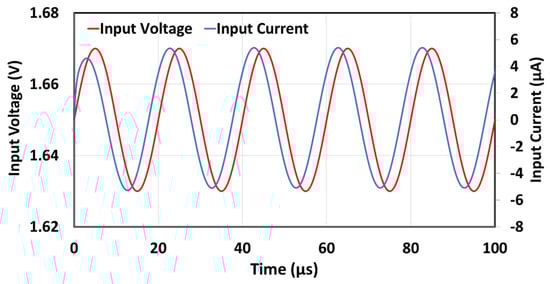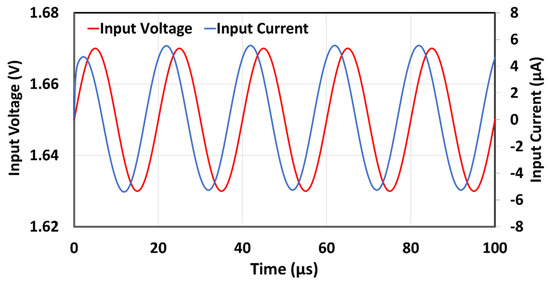 Figure 19, Figure 20 and Figure 21 present the results of the post-layout transient analysis. For each angle, the circuit was tested with a sine wave of 50 kHz (the central frequency within an operating range) and a 20 mV peak-to-peak amplitude. As expected, the corresponding phase shift between input voltage and input current was observed (−30°, −45°, and −60°). Since the amplitude of the input signal is relatively small and the OTAs used for the approximation are linear in this range, the input current distortion cannot be noticed.