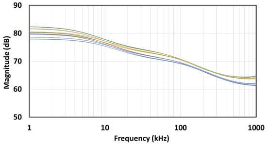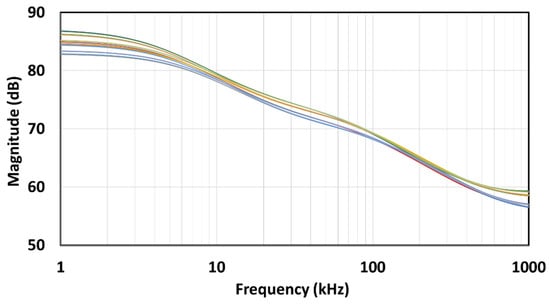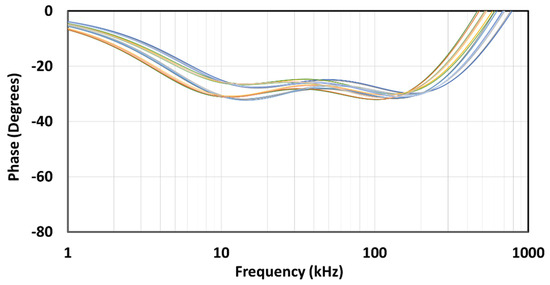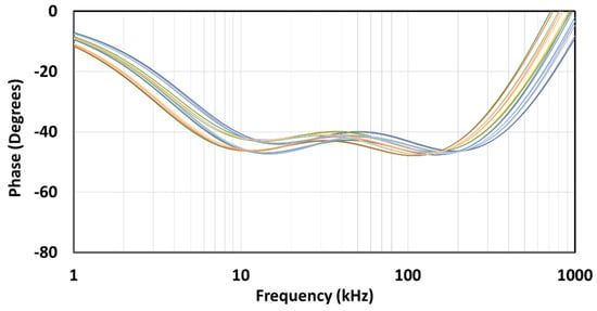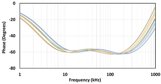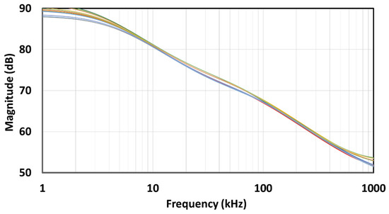 The PVT corner analysis was conducted for the extreme cases in the process (ss, ff, sf, fs), temperature (−10 °C and 110 °C), and supply voltage (3.5 V and 4.5 V). The resulting magnitude-frequency and phase-frequency characteristics for the implemented angles are shown in Figure 22, Figure 23, Figure 24, Figure 25, Figure 26 and Figure 27. It can be observed that the dispersion of the characteristics is lower as the angle is closer to 90°, i.e., a classical capacitor. Further investigation showed that the supply voltage has very little effect on the characteristics, so the main contributing factors to the dispersion are the process and temperature.