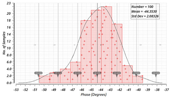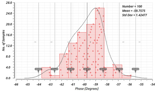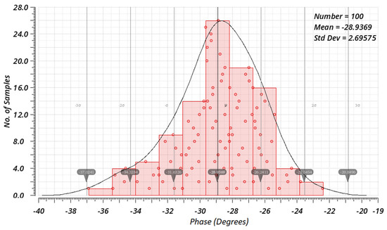 As additional verification, the Monte Carlo (MC) analysis for process and mismatch combined was conducted (100 samples for each angle). As a result, histograms showing variations in average phase shifts are presented in Figure 28, Figure 29 and Figure 30. The MC results also indicate greater variations as the angle is further away from 90°. Observed standard deviations are 2.696°, 2.083°, and 1.425° for angles of 30°, 45°, and 60°, respectively.