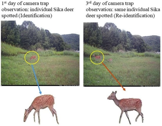 Identification and re-identification of individual Sika deer spotted at two different days of camera trap deployment.