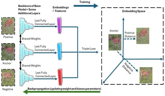 Initially, we fed the generated triplets (anchor, positive, and negative images) through three branches of our Siamese Network Architecture, each employed with the same backbone as the base model. This crucial step involved passing the anchor, positive, and negative images independently through the chosen CNN backbone, which served as a feature extractor. After extracting features, the Siamese Network proceeded to compute the triplet loss [], which is essential for tasks like re-identification during training (Figure 4). Mathematically,