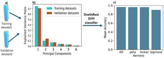 In our evaluation of kernels for the OneVsRest SVM classifier, the rbf kernel emerged as the most suitable option, achieving a mean accuracy of 0.96 through 10-fold cross-validation. Additionally, the GridSearchCV library optimized the gamma and C values (hyperparameters) exclusively for the OneVsRest SVM classifier with the rbf kernel. We identified optimal settings for a gamma value of 10 and C value of 0.001 for our feature datasets. The uses of 10-fold cross-validation for accuracy assessment and the GridSearch library for hyperparameter tuning are widely recognized techniques for effectively tuning models to datasets [,].