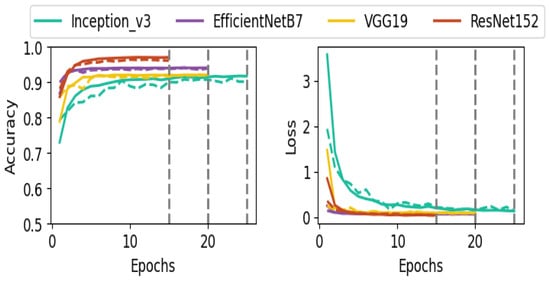 VGG19, a simple and straightforward architecture that achieved second place in the ImageNet competition in 2014, consists of 19 convolutional layers with ReLU activation functions and a kernel size []. ResNet152, known for its effectiveness in identification tasks, uses residual connections to address the vanishing gradient problem, boasting 152 fully connected layers []. EfficientNetB7 utilizes a compound scaling method to simultaneously adjust the network width, depth, and resolution, optimizing performance and efficiency. It heavily employs depth-wise separable convolutions to reduce parameters and computational cost []. Inception_v3 incorporates factorized convolutions to reduce parameters and computational cost and auxiliary classifiers during training to mitigate the vanishing gradient problem and regularize the network [].