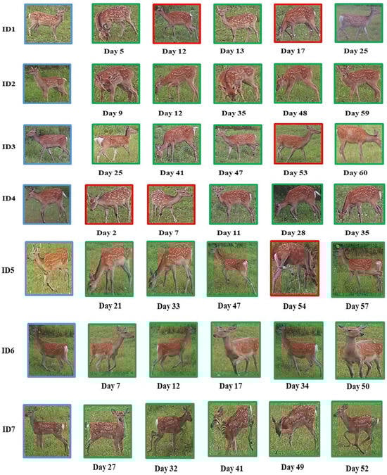 In evaluating the performance of our ResNet152 model using the testing datasets, we observed that the model effectively recognized individual Sika deer across different days of camera trap deployment. Here, we present a visual analysis of the model’s performance. A sample image, distinguished by a blue rectangle, was used as a reference for comparing the respective Sika deer individuals. Images highlighted with green rectangles signify the accurate identification of the individual Sika deer classes by the model, whereas those within red rectangles denote incorrect class predictions (Figure 7).