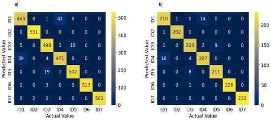 The overall accuracy score for both the training and validation datasets was an impressive 0.96. Specifically, the classifier excelled in accurately classifying ID2, ID6, and ID7, achieving a perfect accuracy of 1 for both the training and validation datasets. For the other individuals, the accuracy remained consistently high, surpassing 0.90 on both datasets. Moreover, other performance metrics such as the precision, recall, and F1-score reflected this trend. ID2, ID6, and ID7 exhibited almost identical scores close to 1 across these metrics on both the training and validation sets. Similarly, for ID1, ID3, ID4, and ID5, these metrics displayed strong performances, also exceeding 0.90 on both datasets as well (Table 2).