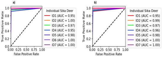 AUC-ROC curve of training and validation datasets for seven individual Sika deer. (a) Training datasets. (b) Validation datasets.
