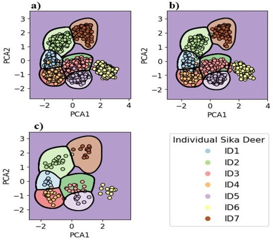 Decision boundary of training and validation datasets for classifying seven individual Sika deer. (a) Training datasets. (b) Validation datasets. (c) Testing datasets.