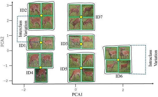 In this context, = the centroid value of PCA1 for one class of Sika deer, while = the centroid value of another class. Similarly, and = the centroid values of PCA2 for each respective class of Sika deer (Figure 11; Table 3). Moreover, to understand the variability within the same class of Sika deer, we computed the intraclass variation. We also used the same euclidean distance Equation (7), where and = the maximum and minimum values of PCA1 within a specific class, while and = the maximum and minimum values of PCA2 within the same class of Sika deer (Figure 11; Table 3). The interclass variation between ID1 and ID4 was found to be very minimal, similar to the situation observed between ID3 and ID5 (Table 3). These minimal interclass variations explicitly demonstrate the misidentification of the respective Sika deer class.