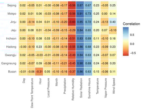 The decision to limit our investigation to South Korea is not merely a matter of convenience; it is a strategic choice based on the country’s distinctive geographical and climatic diversity. South Korea encompasses a diverse array of environments, including rugged inland terrains (e.g., Gwangju, Hadong, and Jinju), expansive coastal lines (e.g., Busan, Gangneung, Incheon, and Mokpo), isolated islands (e.g., Jeju), and other unique locations (e.g., Sejong). Each of these environments offers distinct data on solar energy dynamics. Moreover, the well-defined seasonal variations, ranging from cold, snowy winters to hot, humid summers, provide an invaluable framework for analyzing the efficacy and resilience of PV systems under varying meteorological conditions. These characteristics make South Korea an exemplary setting for studying solar energy dynamics, with findings that are relevant both locally and in similar climates worldwide [45]. Our methodology leverages South Korea’s geographical and climatic heterogeneity to explore essential questions about solar PV power generation efficiency and its environmental susceptibility. Through this approach, we aim to deliver original insights into optimizing PV systems for diverse global environments, significantly enriching the field of renewable energy research.