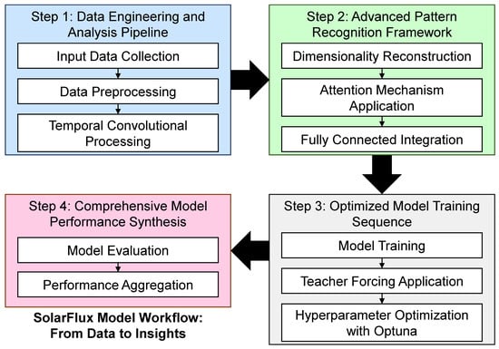 In this study, we proposed SolarFlux, a deep NN model designed to improve the prediction accuracy of time series data. SolarFlux utilizes TCNs, which efficiently process temporal information. The model incorporates dilated convolutions and residual connections to expand its receptive field, thereby reducing information loss and preventing gradient decay in deep networks. In addition, SolarFlux incorporates a self-attention mechanism that dynamically understands data interactions, allowing it to effectively handle complex sequence patterns through a temporal fusion transformer. Teacher forcing and hyperparameter optimization with Optuna are implemented to improve prediction accuracy and maximize the model’s performance. The overall structure of the SolarFlux model is illustrated in Figure 2.