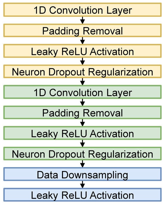 Figure 3 illustrates the detailed setup of a TemporalBlock, where the first convolutional layer performs a dilated convolution and introduces nonlinearity through an activation function (LeakyReLU) and dropout to prevent overfitting. The second convolutional layer follows the same process, and the outputs of these two layers are combined with the input via residual concatenation. We integrate Equation (1) for the output of a dilated convolution operation as follows: