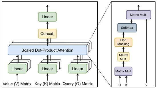 The self-attention mechanism generates three distinct representations of each element within the input sequence: Query, key, and value [52]. These are used to compute the attention scores as follows: Each “Query” matrix Q is multiplied by the transpose of each “Key” matrix K and scaled by the inverse square root of dk, the dimension of the key vector. This process is crucial for comprehending the interaction depicted in Figure 4. The resulting matrix is then normalized using the softmax function, which computes the final attention scores. These scores reflect the significance of each element’s influence over others in the sequence. This calculation, as outlined in Equation (2), serves as the foundation for the weighted aggregation performed using the “Value” matrix V, resulting in the output that represents the attended features of the input sequence.