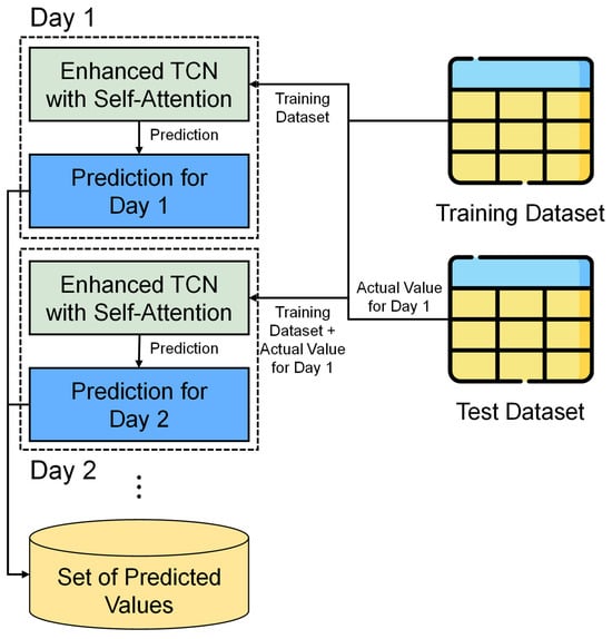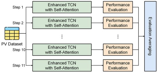 The multi-time step prediction method is critical in time series data analysis because it allows models to predict successive data points over multiple time points [54,55]. This method helps to effectively capture the continuity and complex dependencies of time series data. By predicting over multiple time steps, the model gains a deeper understanding of the dynamic changes and patterns, such as fluctuations in solar PV power generation, over time. In this study, forecasts were made for multiple time points from 8 a.m. to 6 p.m., tailored to the operational needs of the solar power industry, as depicted in Figure 5.