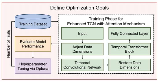 In the third step, the mean squared error (MSE) is used as the performance evaluation metric, with the goal of minimizing the MSE on the validation dataset. Optuna explores the hyperparameter space over a predefined number of trials, systematically refining the model settings. In the final step, the optimal set of hyperparameters determined by Optuna is used to reconstruct the TCN model and perform a final training on the full dataset to evaluate the generalization ability of the model. This optimization process is illustrated in Figure 7.