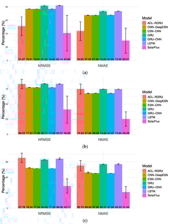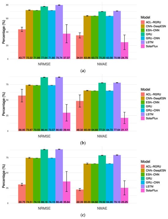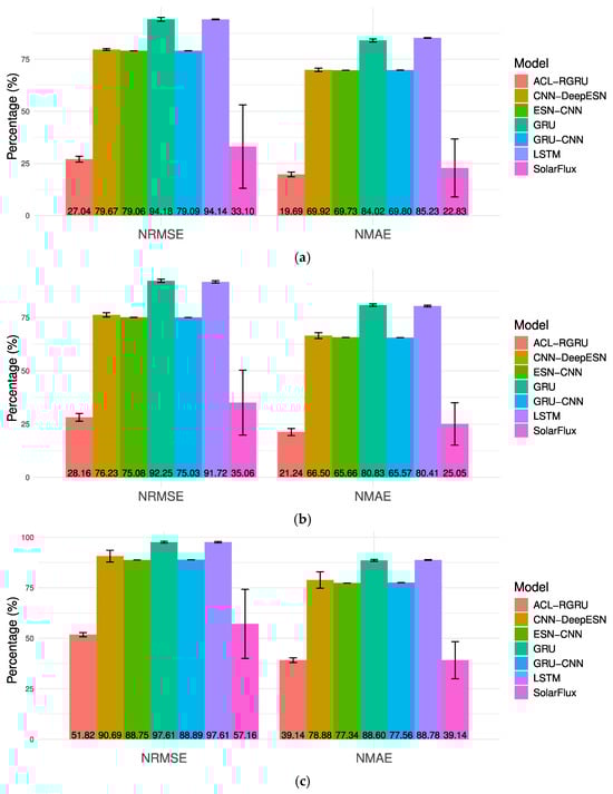 As illustrated in Figure 9, SolarFlux exhibited commendable performance in the cities of Hadong and Incheon, although it was slightly outperformed by ACL-RGRU. For instance, in Incheon, SolarFlux exhibited an average NRMSE of 35.06% and NMAE of 25.05%, which were comparable to ACL-RGRU’s 28.21% NRMSE and 21.24% NMAE. This demonstrated a robust performance in a challenging environment with complex weather patterns. In Jeju, SolarFlux also demonstrated robust results, with an average NRMSE of 57.16% and NMAE of 39.90%. These figures were just behind those of ACL-RGRU, which had slightly better figures.