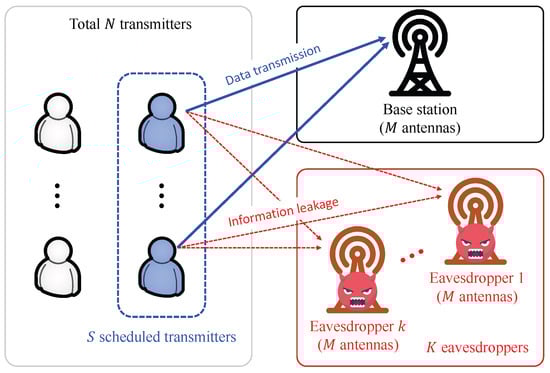 As illustrated in Figure 1, we consider a time-division duplexing (TDD) uplink multiuser network which consists of N transmitters (users or IoT devices), a single desired receiver (base station: BS), and K independent eavesdroppers. We assume that each transmitter is equipped with a single antenna, and base station and each eavesdropper have M antennas, respectively. We consider a block-fading channel model, where the channel is constant within a single block and independently varying in the next block. During one symbol time, S transmitters are scheduled for data transmission. Thus, it can be modeled by a single-input and multiple-output (SIMO) multiple access channel (MAC).