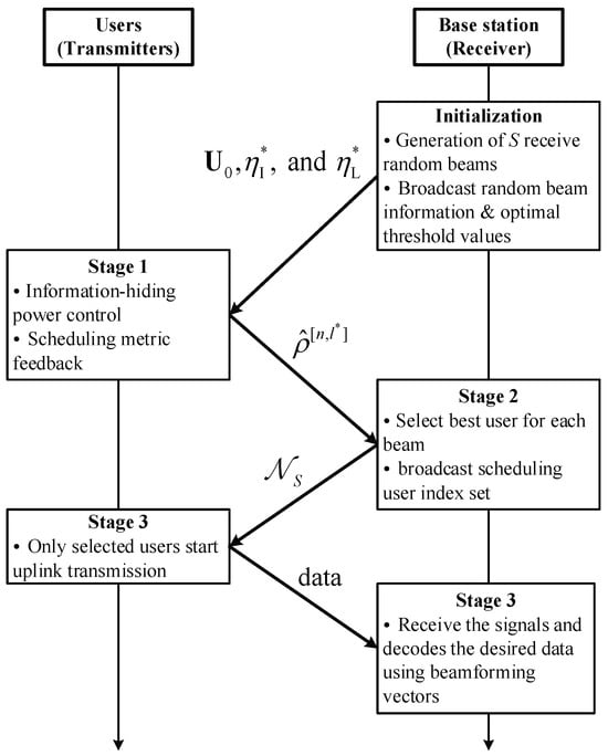 After receiving N transmitter’s feedback information, the base station selects the best S transmitters corresponding to S receive vectors and broadcast scheduling transmitter index set to all transmitters. The Hungarian method [] is one of the possible candidate algorithms for assigning the best transmitters to the receive beams.