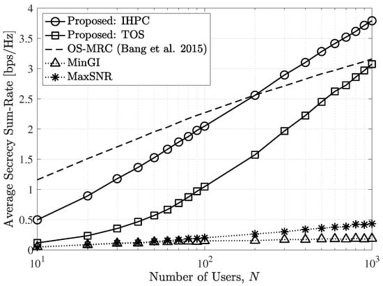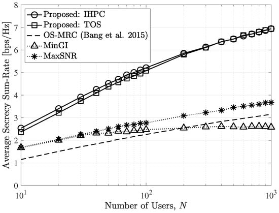 Average achievable secrecy sum-rate for varying the number of users when , , and dB [].