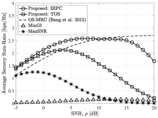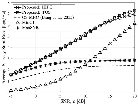 Average achievable secrecy sum-rate for varying SNR when , , and [].