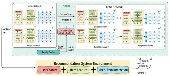 Integration with SAC: The SAC [39] algorithm, known for its stability and efficiency in continuous action spaces, employs an entropy-augmented reinforcement learning strategy that encourages exploration by maximising a trade-off between expected return and entropy. Integrating the Non-stationary Transformer into SAC involves embedding this advanced architecture into both actor networks and critic networks (Figure 4). It enhances their capability to process sequential decision-making tasks by capturing the complex dependencies in user-item interactions. The transformer’s ability to handle temporal dynamics and non-stationary data significantly improves the policy’s adaptability and the precision of action selection in dynamic recommendation environments. The core of enhanced SAC consists of two actor networks and , and four critic networks , , , and , where and denote the parameters of the actor and critic networks, respectively. Including the non-stationary transformer in the four critic networks enables a more nuanced valuation of the state-action pairs, considering the evolving nature of user preferences and item attributes. The objective function for the actor network in enhanced SAC with the non-stationary transformer is given by:
