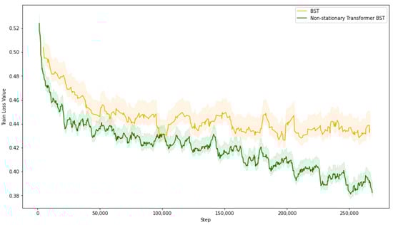 Using PyTorch as the computational framework, we used the Tenrec video dataset for the click-through rate prediction task, dividing it into three subsets: 70% for training, 15% for validation, and 15% for testing. Table 1 provides a summary of these splits. We trained two models on the training set: the baseline BST model and our enhanced version, which incorporated the non-stationary transformer. As depicted in Figure 5, the baseline BST model’s loss gradually converges to approximately 0.43, while the non-stationary transformer BST model demonstrates a more significant loss reduction, converging around 0.39. This notable difference indicates that our non-stationary transformer BST model achieves a lower train loss overall, suggesting enhanced learning efficiency. Then, we plan to extend this comparative analysis to the test set to validate the models’ performance and ascertain whether the lower train loss translates to improved prediction accuracy on unseen data.