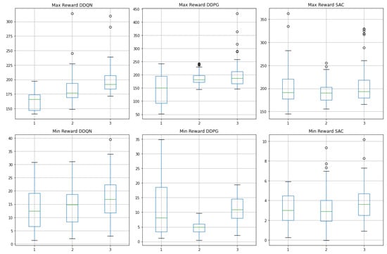 For each model during the 10,000 epochs, we stored the optimal parameters. Then, post-training evaluations were conducted on the RL4RS-Slate dataset by recording the performance across 50 episodes for each model variant within the DDQN, DDPG, and SAC frameworks by randomly starting. We collected the maximum and minimum rewards for each episode and the average across the episodes. The results, depicted in Figure 7, exhibit the reward distribution for the original models, those with an added transformer layer, and those enhanced with the non-stationary transformer layer. The box plots in Figure 7 show that models incorporating the transformer layer (marked as “2” in each subplot) display a more concentrated range of rewards, suggesting that the transformer layer contributes to a more effective learning of the sequential patterns present in the dataset. However, this may come at the cost of losing some inherent data characteristics due to a stationary assumption. In contrast, the non-stationary transformer models demonstrate an extended range of maximum and minimum rewards, retaining the data’s non-stationary features and indicating their ability to maintain higher reward potential. An additional observation is that the maximum rewards achieved by the DDPG and SAC models frequently surpass 200, a benchmark that only a minority of the DDQN episodes exceed. This outcome is attributed to the policy gradient nature of DDPG and SAC, which enables a more effective exploration of optimal strategies than DDQN. Moreover, SAC exhibits the smallest minimum rewards, often between 3 and 5, suggesting that incorporating entropy regularisation promotes exploration, occasionally leading to suboptimal strategies.