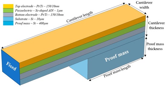 The purpose of the research work is to obtain a lead-free energy harvester for supplying inaccessible low-power sensors or sensor networks. It is based on a MEMS device with 20 piezoelectric harvesting cantilevers, designed as unimorph cantilevers working in flexure mode and with the 3–1 transversal mode as the electromechanical coupling mode (the electric field is produced on an axis orthogonally to the axis of applied stress). An overview of one piezoelectric cantilever is presented in Figure 1. The flexure mode is the first mode of vibration and has the lowest resonant frequency. It also provides the largest deflection and therefore the largest amount of electrical energy. Adding a proof mass will further lower the resonant frequency to a resonant frequency closer to the physical vibration sources.