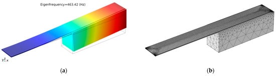 (a) The first vibration mode (flexure mode) for the piezoelectric cantilever; (b) the mesh for the simulated structure.