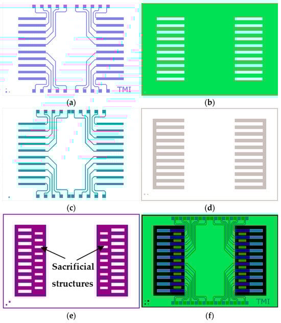 The process masks for one MEMS device: (a) Mask 1—bottom electrode patterning; (b) Mask 2—piezoelectric configuration; (c) Mask 3—top electrode patterning; (d) Mask 4—cantilevers configuration; (e) Mask 5—cantilevers release; (f) overlaying of the five masks.