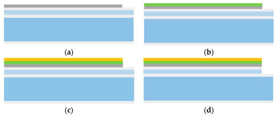 Using the geometric parameters from the simulation, we designed the fabrication masks (Figure 3) and the process flow (Figure 4). The process flow consists of five masks and deploys MEMS technologies for the fabrication of the energy harvester. It was designed for using only positive photoresists. The masks and process flow were fabricated by IMT-Bucharest, through IMT-MINAFAB, except for the piezoelectric layer which was provided by PIEMACS Sàrl (Lausanne, Switzerland).