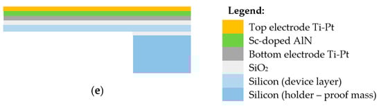 The next step is the deposition of the piezoelectric layer by RF sputtering (Figure 4b) and its patterning using Mask 2 (Figure 3b). The piezoelectric layer is 12% Sc-doped AlN and was possible thanks to PIEMACS Sàrl. The relative dielectric constant of the piezoelectric material is around 13 and its piezoelectric coefficient is around e31,f = 1.3 C/m2 [20]. Also, the dielectric loss did not increase with Sc doping [20].