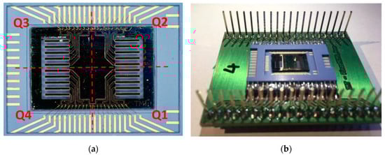 Following the steps described in the previous section, we obtained several silicon die structures for our prototype harvester (PZ-EH). One such die structure has an area of 1.02 cm2. Further on, this die is fixed onto a custom-design ceramic package, with wire bonds connecting from die contact pads to the external pins on the ceramic package (illustrated in Figure 5a), which is finally soldered onto a test printed circuit board (PCB) (illustrated in Figure 5b). These steps facilitate easy access to each individual cantilever’s electrical output, for measurements in evaluation and characterization, which we will discuss next. The ceramic packaging for PZ-EH was provided by HIPOT-RR (Otocec, Slovenia). It was made using low-temperature co-fired ceramic (LTCC) and is described in [23]. It also has a lid which we did not use for this step in the project.