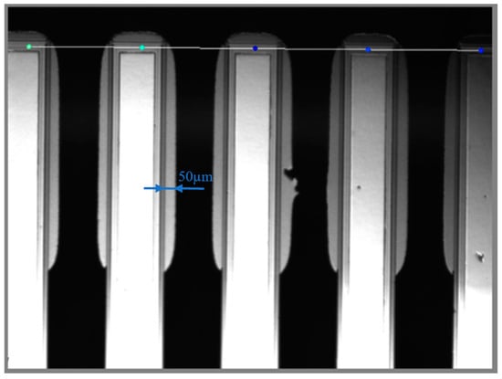 The resonant frequency, f, of the piezoelectric cantilevers was measured using a Doppler interferometer-based vibration analyzer system, MSA-500 from Polytec (Irvine, CA, USA). A test structure sample is placed under mechanical excitation and the resonant frequency is detected using a laser beam shined on the tip of the cantilever, as shown in Figure 6. This type of measurement offers information about the phase, φ, and the quality factor, Q, too. The results are presented in Table 1.