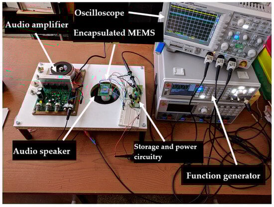 The electrical measurements were made using the experimental setup described in Figure 7. This setup serves to provide a known and controlled mechanical excitation to the DUT, for characterizing our PZ-EH devices. A function generator allows us to fine tune the resonant frequency of the device with the help of the audio amplifier and the audio speaker. For the audio speaker, we used a Somogyi Audio Line SRP1010 woofer (50 W, 8Ω) and it was calibrated with a ~20 grams load (equivalent mass of the encapsulated MEMS and accelerometer) using a commercial system. Independently to the calibration, we also measured the acceleration using a 820M1 single-axis condition-monitoring accelerometer from TE connectivity [24]. The connections between the encapsulated device (presented in Figure 5b) and the additional electronics circuitry are made using a breadboard. The signals’ waveforms are monitored using an oscilloscope.