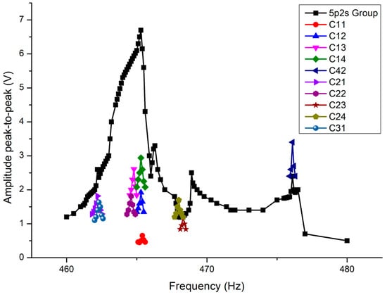 An array of cantilevers could provide us with a bandwidth of frequencies out of which we could collect energy from the environment. The 10 connected cantilevers (Table 2) were grouped in 2 branches in series, with 5 cantilevers in parallel in each group (5p2s group). The array can be described as follows: the 1st branch is composed of cantilever 1 from quadrant 1 (C11) in parallel with cantilever 2 from quadrant 1 (C12) in parallel with cantilever 3 from quadrant 1 (C13) in parallel with cantilever 4 from quadrant 1 (C14) in parallel with cantilever 2 from quadrant 4 (C42), in series with the 2nd branch composed of cantilever 1 from quadrant 2 (C21) in parallel with cantilever 2 from quadrant 2 (C22) in parallel with cantilever 3 from quadrant 2 (C23) in parallel with cantilever 4 from quadrant 2 (C24) in parallel with cantilever 1 from quadrant 3 (C31). Grouping the 10 cantilevers resulted in an increased bandwidth of the response, as shown in Figure 8. The excitation acceleration was 1 g and the measurements were made using the oscilloscope probes, without connecting the cantilevers or the 5p2s group to the additional electronics. The uncertainty for the peak-to-peak amplitude measurements was below 5% and for the frequency measurements, it was below 1 Hz. This design gives us the possibility to connect multiple cantilevers in a small area.