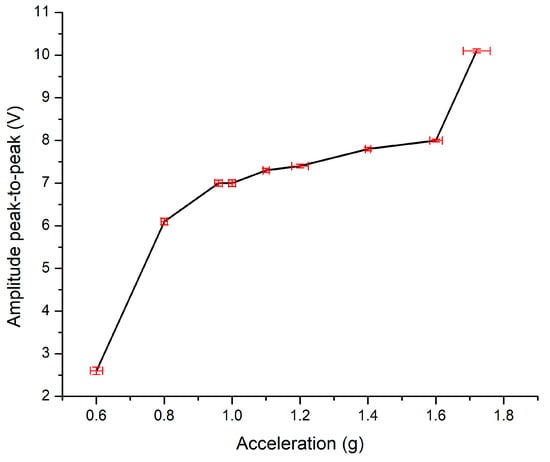 The 5p2s group’s performance, relative to the applied test’s vibration acceleration, is shown in Figure 9. The measurements were made at a resonant frequency of 465.2 Hz, with the 5p2s group’s electrical output being loaded only by the oscilloscope probe (10 MΩ, 8 pF). The response amplitude shows substantial increases at 0.8 g and 1.7 g. A possible explanation is a slight shift (+/−1 Hz) in acceleration for the resonant frequencies or phases from the component cantilevers, resulting in a better matching for the overall grouping.